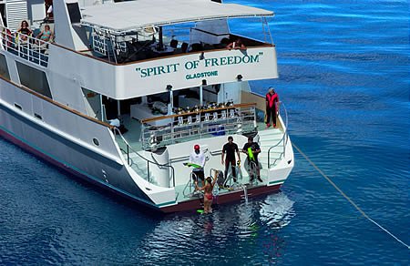 Transfers to/from your Cairns city accommodation. Please state your accommodation in the space provided on the booking form. Boarding of Spirit of Freedom is from 11.15 -11.30am Monday morning, for a 12.00 noon departure. The vessel is located at Trinity Wharf at the end of Lake Street. Taxis and coaches can drive up onto the wharf to locate the vessel, which is usually berthed under the clock tower.
