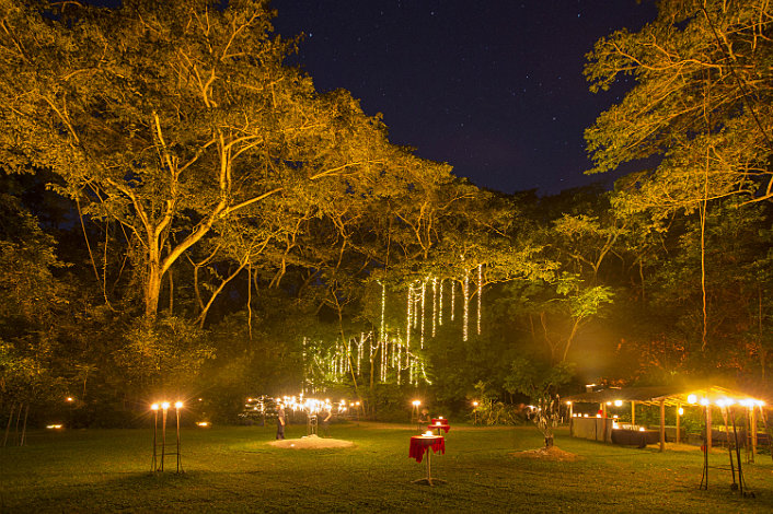 Tuesdays, Thursdays ONLY • Return Hotel Coach Transfers from Cairns and Palm Cove • Flaming arrival and candle lit forest setting under a silk lined marquee with hand made crystal chandeliers • Sparkling wine and Hors d’oeuvres on arrival at Pre Dinner Drinks • Seven dish plattered banquet served to your table seated under a magnificent black silk lined marquee highlighted by crystal chandeliers • Aboriginal Cultural Performance featuring didgeridoo, storytelling and song • Australian sparkling wine, red and white wine, beer and soft drinks • Shared tables of ten so you can enjoy the company of other intrepid travellers