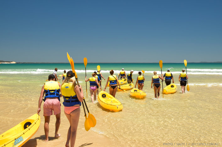 Experience an Epic Ocean Adventure back to nature and into the wild with our Dolphin View Kayak Tour. We take you on a stunning Great Beach Drive into the Great Sandy National Park to the spectacular Double Island Point. This location features scenic views of the Rainbow Beach coloured sands and Fraser Island, crystal clear waters warm all year round and lots of different wildlife to see.